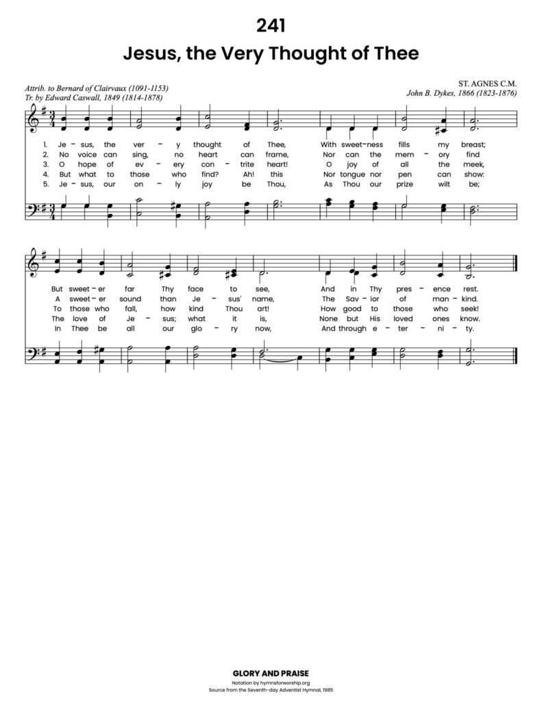 Bernard of Clairvaux (1091-1153; see SDAH 156) wrote a long poem of about 48 stanzas entitled “Jesu, dulcis memoria” (“Jesus, Sweet Memory), probably after the disastrous Second Crusade, which he fostered, and during his retirement in about 1150. It is now known as the “Joyful, or Jubilee, Rhythm of St. Bernard on the Name of Jesus.” There have been many translations of this hymn (for example, SDAH 242), this one by Edward Caswall (1814-1878; see SDAH 43.) Bernard also wrote hymns SDAH 156, “O Sacred Head Now Wounded” and 242, “Jesus Thou Joy of loving Hearts.” Caswall also translated hymn SDAH 43,” When Morning Gilds the Skies.”