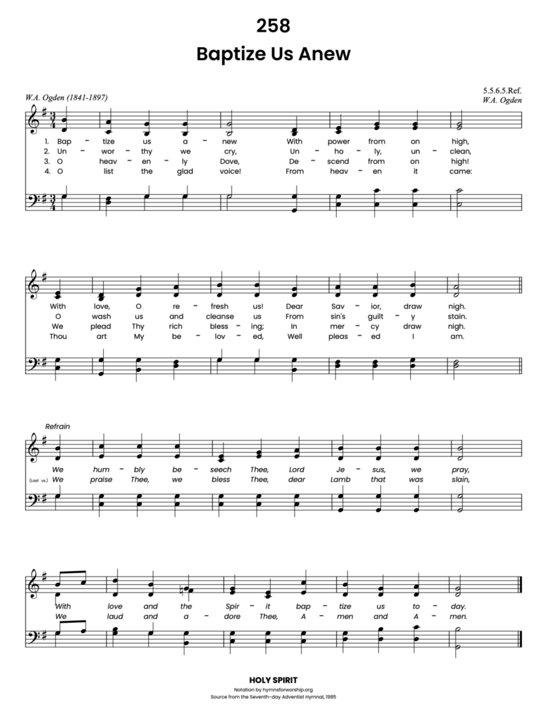 William Augustine Ogden’s hymn seeks not water baptism, but a renewed filling of the Holy Spirit. Written in the late 1800s, it invites worshipers to experience personal revival. The unnamed tune, also by Ogden, is warm and accessible, suitable for congregational prayer. May this hymn renew our thirst for God’s Spirit to move in our lives.