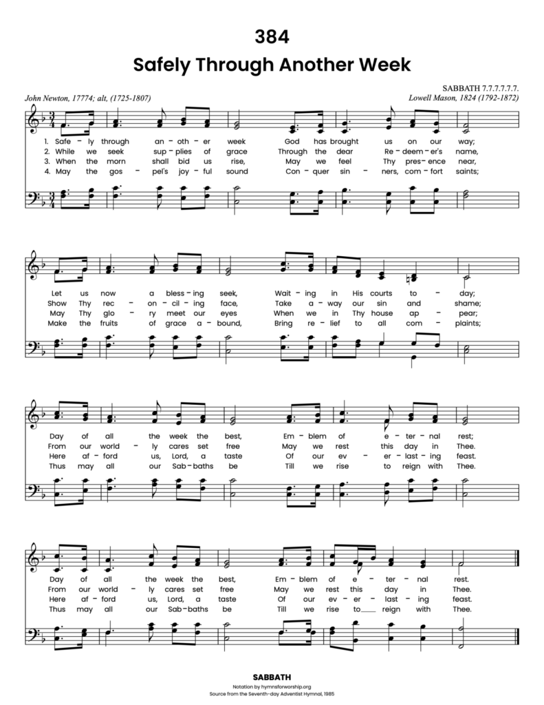 Originally titled Saturday Evening, this hymn by John Newton (1774) was a reflection of Sabbath preparation, aligning with the biblical practice of beginning the day of rest “from even unto even” (Lev. 23:32). Its verses trace the transition from a week of labor to the joy and peace of Sabbath worship. Lowell Mason’s tune SABBATH (1824), written specifically for Newton’s words, beautifully supports the hymn’s prayerful gratitude for God’s preserving care and the sacred hours set apart for communion with Him.