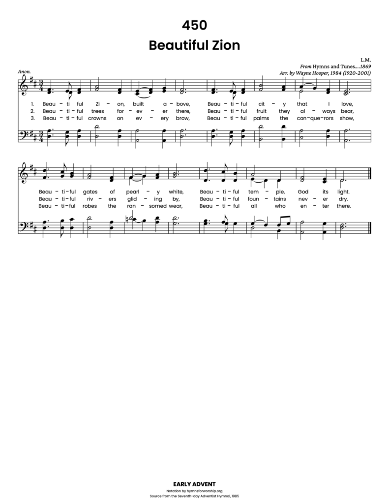 The arrangement by Wayne Hooper (1920-2017) is based on the music James White printed in his Hymns and Tunes for Those Who Keep the Commandments of God and the Faith of Jesus, 1869.